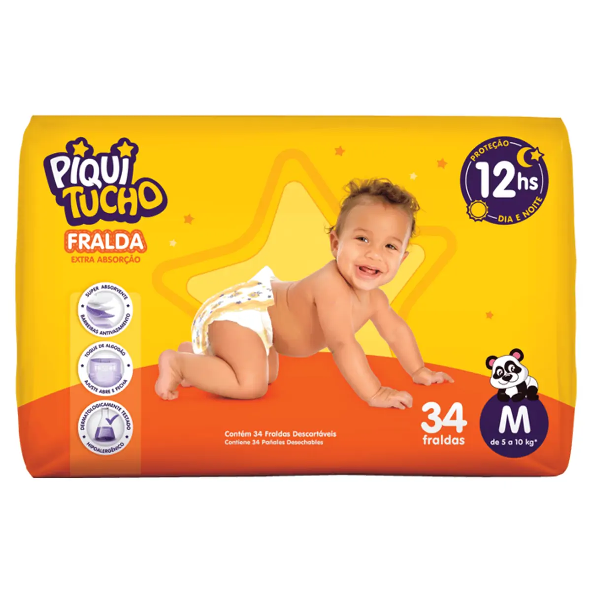 Apresentamos as Fraldas Infantis Piquitucho: super absorventes por 12 horas, com barreiras antivazamento. Enriquecidas com aloe vera, toque de algodão, ajuste abre e fecha, hipoalergênicas e dermatologicamente testadas. Conforto e cuidado para o seu Piquitucho! As Fraldas Infantis Piquitucho tamanho M, com 34 tiras, oferecem 12 horas de absorção superior e contam com barreiras antivazamento. O extrato de aloe vera mantém a pele do bebê hidratada, enquanto o toque de algodão garante conforto. O ajuste abre e fecha, aliado à hipoalergenicidade e testes dermatológicos, proporciona cuidado excepcional.