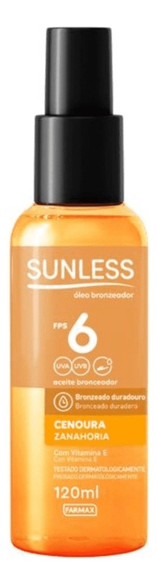 Bronzeador Sunless FPS6 em óleo de cenoura, 120 ml, oferece um bronzeado uniforme com acabamento leve. Ideal para quem busca um resultado natural sem alta proteção solar. A fórmula conta com vitamina E para cuidado da pele durante a exposição ao sol. O produto é resistente à água e pode ser aplicado no corpo, facilitando a rotina de bronzeamento em dias de sol. Sua textura não oleosa ajuda a rápida absorção, evitando sensação pegajosa. Perfeito para quem quer manter a pele com um tom dourado ao longo do dia, sem complicações. Utilize conforme o seu tempo de sol e reaplique conforme necessário. Este item é importado, oferecendo uma opção simples de autocuidado para quem gosta de cuidar da pele com praticidade e conforto.