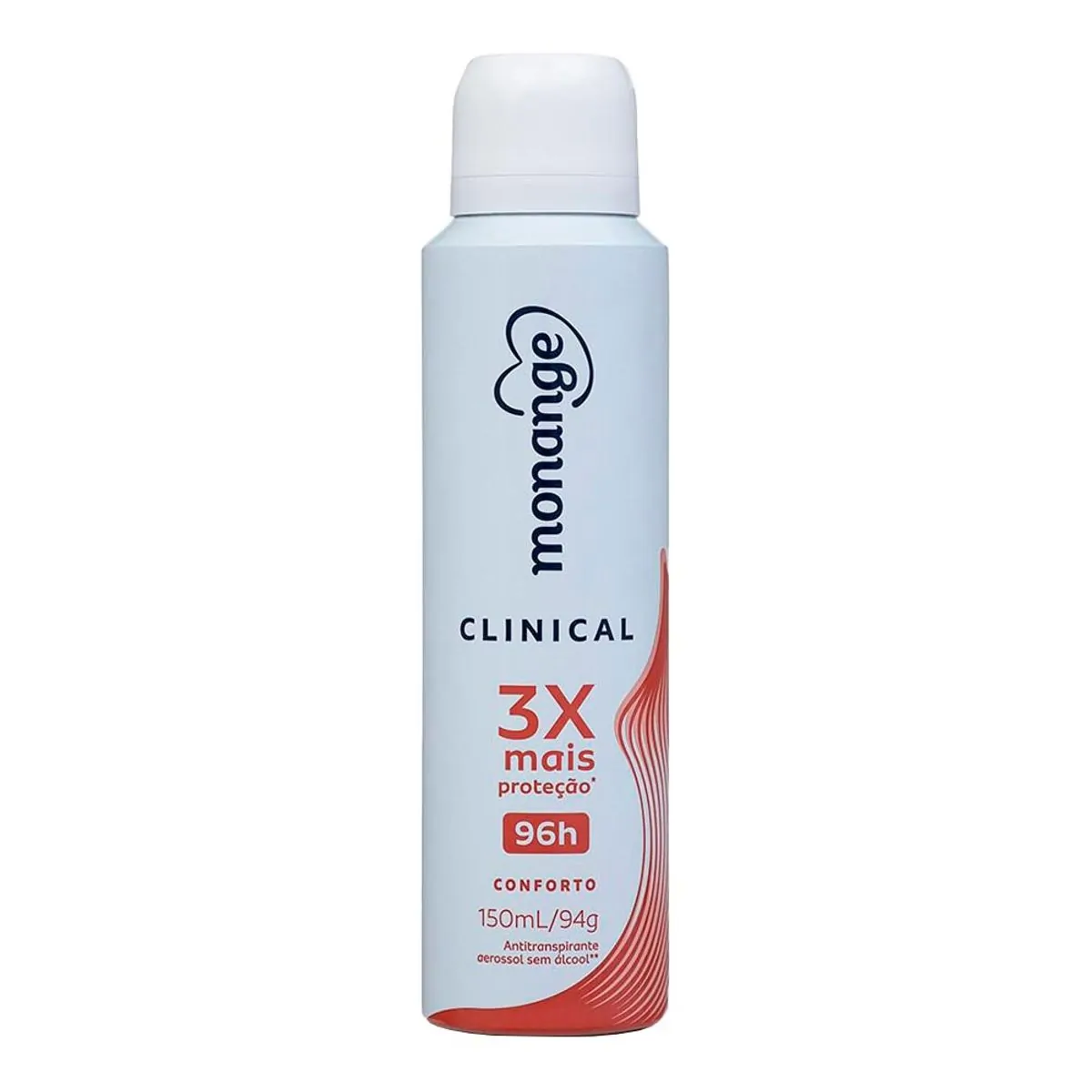 O novo Desodorante Clinical Conforto Aerossol Antitranspirante Monange foi desenvolvido com máxima proteção para as suas axilas, com tecnologia total controle que oferece desempenho 3 vezes maior do que os antitranspirantes básicos. Com fragrância delicada e cremosa, oferece até 96 horas de proteção para mulheres que não abrem mão da segurança e conforto no dia a dia. Testado dermatologicamente, o antitranspirante não possui álcool em sua fórmula.
