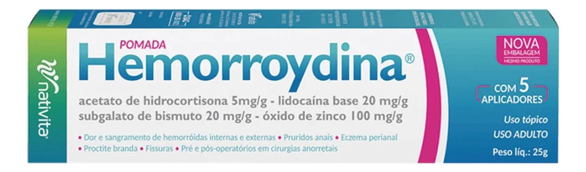 Hemorroydina Pomada 25g da Nativita é apresentada em embalagem prática com bisnaga de 25 g e 5 aplicadores. A fórmula atua como cicatrizante e anti-inflamatória para uso externo, ajudando a manter a pele saudável na área de aplicação. O produto vem com uma apresentação compacta, fácil de aplicar e transportar. Possui características como hipoalergênico e sem fragrância, conforme a linha da marca. Ideal para ter em casa como cuidado simples para a pele local.