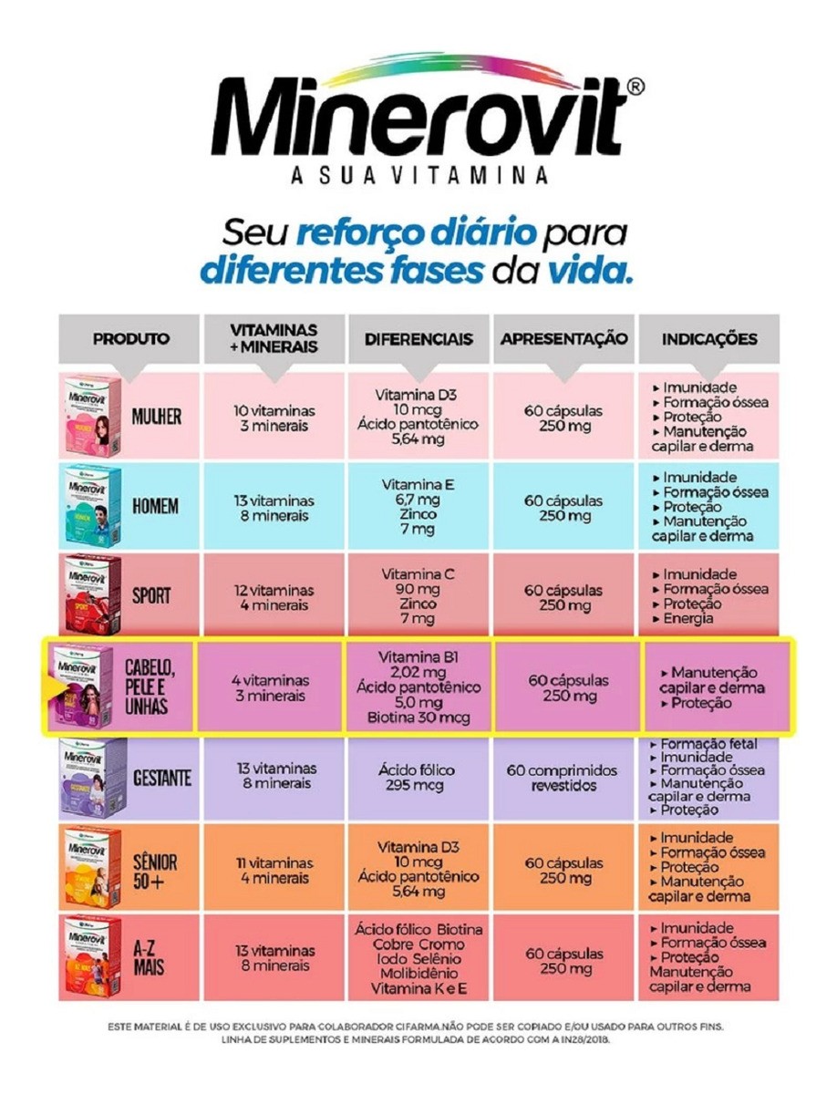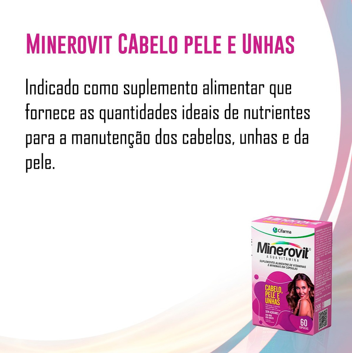 Minerovit Cabelos, Pele e Unhas é um suplemento nutricional em cápsulas, desenvolvido para apoiar a alimentação diária. Cada embalagem traz 60 cápsulas de uso prático, pensadas para facilitar a incorporação na rotina. Formulado com vitaminas, minerais e nutrientes essenciais, o produto oferece suporte nutricional para cabelos, pele e unhas, sem adição de glúten ou lactose. Este suplemento é indicado para quem busca um complemento simples e conveniente para a alimentação diária, mantendo o bem-estar de forma prática. A embalagem é compacta e fácil de guardar. Siga as instruções da embalagem para o consumo diário adequado. Não substitui uma dieta equilibrada e não deve ser usado como tratamento médico.