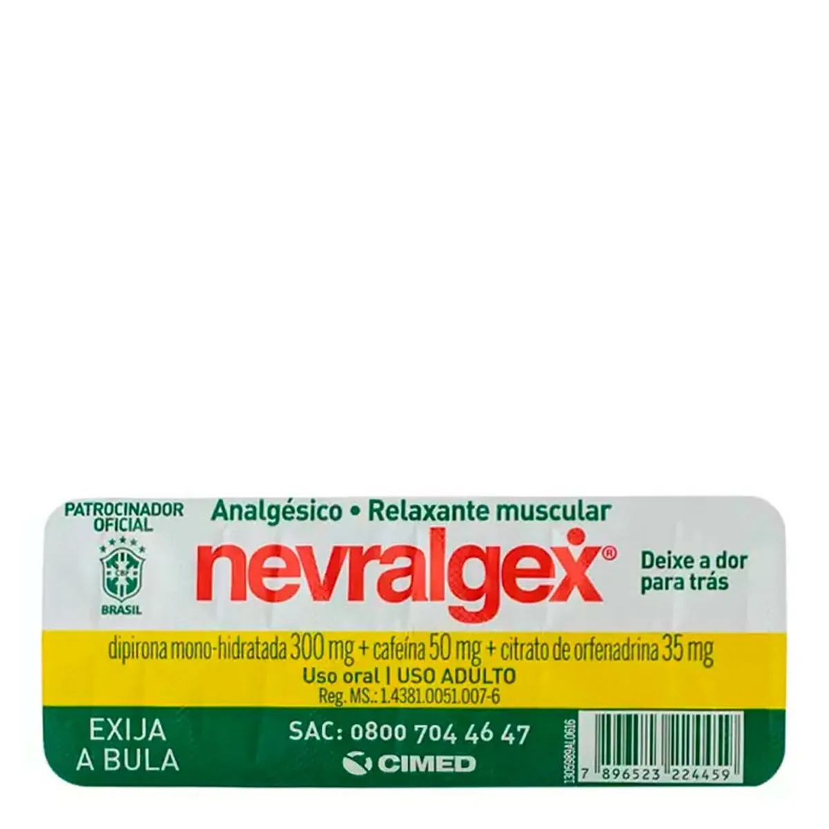 Nevralgex Cimed 10 Comprimidos possui ação analgésica e relaxante muscular. O início da ação ocorre a partir de 30 minutos. Nevralgex não deve ser utilizado nos casos de alergia ou intolerância a qualquer um dos componentes da fórmula, glaucoma (aumento da pressão intraocular), obstrução pilórica ou duodenal (problemas de obstrução no estômago e intestino), problemas motores no esôfago (megaesôfago), úlcera péptica estenosante (estreitamento anormal), aumento da próstata, obstrução do colo da bexiga e miastenia grave (doença neuromuscular que causa fraqueza).