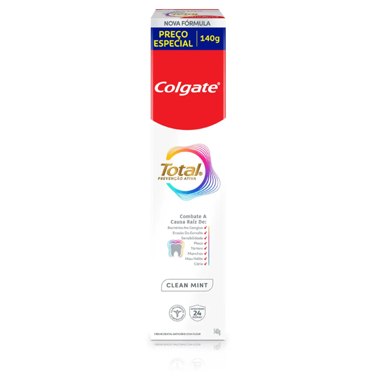 Colgate Total Clean Mint, com prevenção ativa, é a escolha ideal para quem busca o melhor creme dental com flúor e proteção completa. A nova versão do Colgate Total 12 combate as bactérias que são a causa raiz de mau hálito, cárie, placa dentária, tártaro, erosão do esmalte, sensibilidade, acúmulo de bactérias na gengiva e manchas nos dentes.