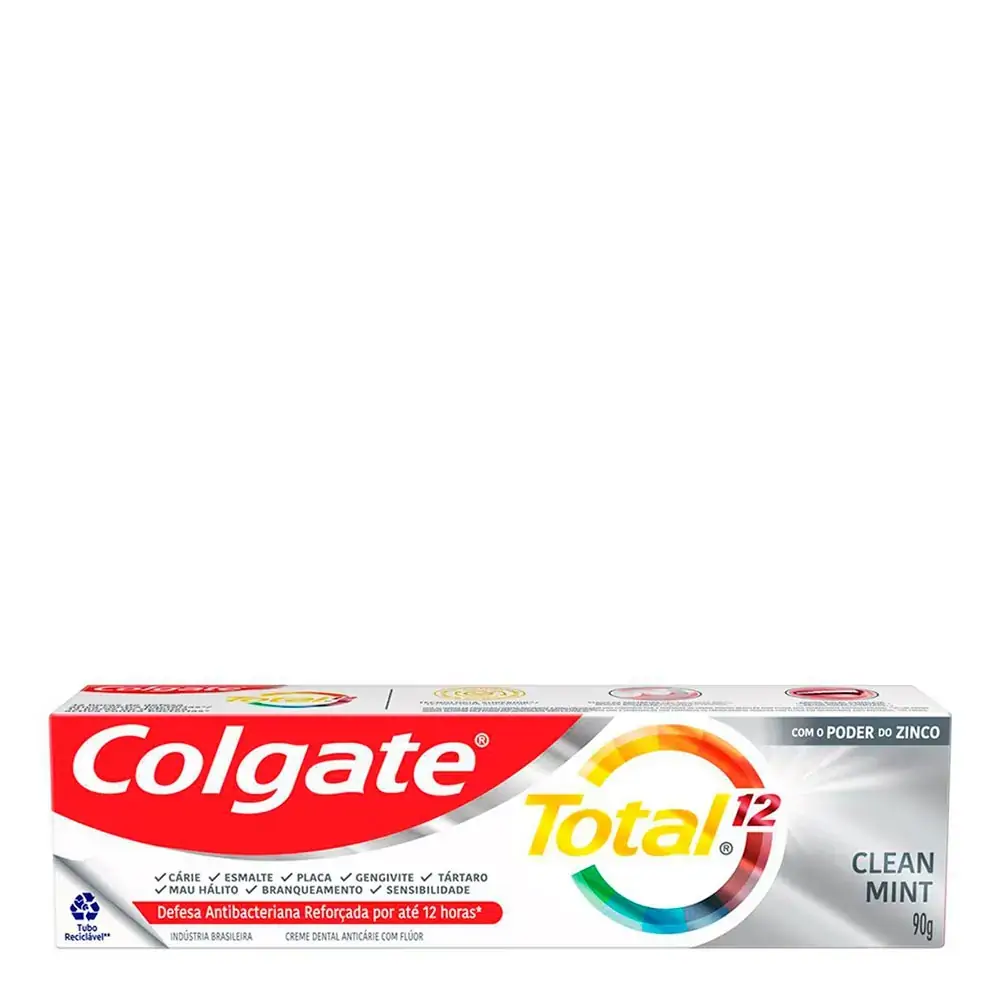 Colgate Total Clean Mint, com prevenção ativa, é a escolha ideal para quem busca o melhor creme dental com flúor e proteção completa. A nova versão do Colgate Total 12 combate as bactérias que são a causa raiz de mau hálito, cárie, placa dentária, tártaro, erosão do esmalte, sensibilidade, acúmulo de bactérias na gengiva e manchas nos dentes.