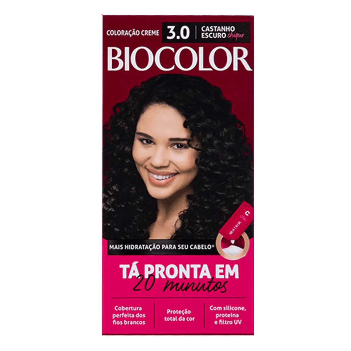 A Tinta de Cabelo Biocolor Mini Kit Castanho Escuro Chique 3.0 está de cara nova e com novidades em sua fórmula de condicionador e fragrância. Oferecendo uma cobertura perfeita dos fios brancos, cor intensa e durabilidade, a coloração é de fácil aplicação e age em apenas 20 minutos. Além disso, o kit promove um banho de hidratação no cabelo com o novo condicionador Hidratação Power que protege e entrega maciez aos fios. Sua composição conta com amônia e um novo aroma floral.